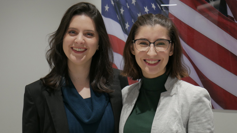 Two SPA employees smiling as they look down at a laptop screen